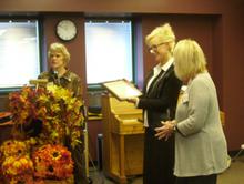 Rev. David Peck (left) receives award from Judy Price (center) and Janet Cella (right).